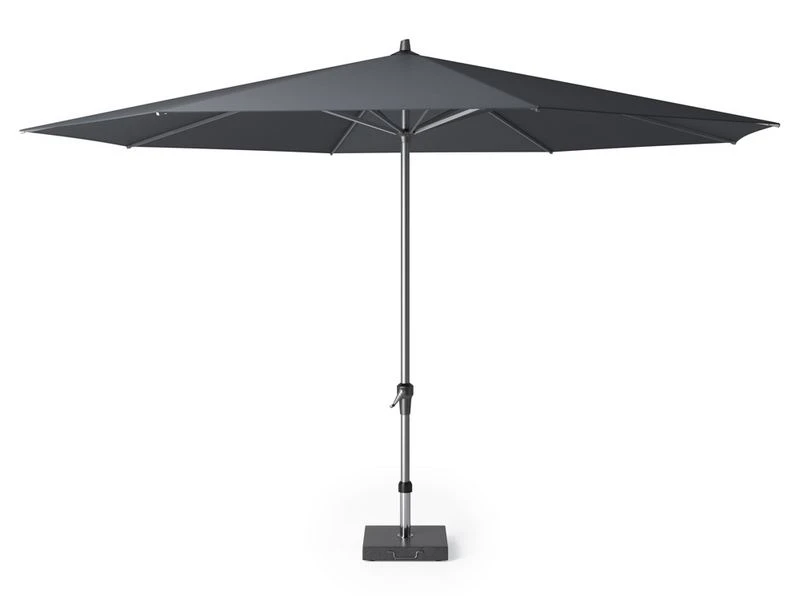 Parasol Riva Ø4,0 van Platinum. Deze moderne en strakke parasol is exclusief ontworpen door Platinum. De Riva parasol is voorzien van een easy-up opdraaimechanisme, doekspanners en een stevige, deelbare mast. De parasol is uitgevoerd met een 220 grams polyester doek met waterafstotende coating. Houd uw parasol als nieuw en dek deze alleen af met een AeroCover ademende parasolhoes wanneer u deze langere tijd niet gebruikt. De parasol wordt zonder voet geleverd. Wij adviseren deze parasol op een Rome 60kg parasolvoet van Platinum te plaatsen.