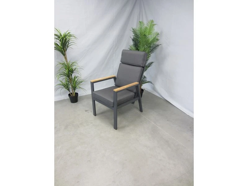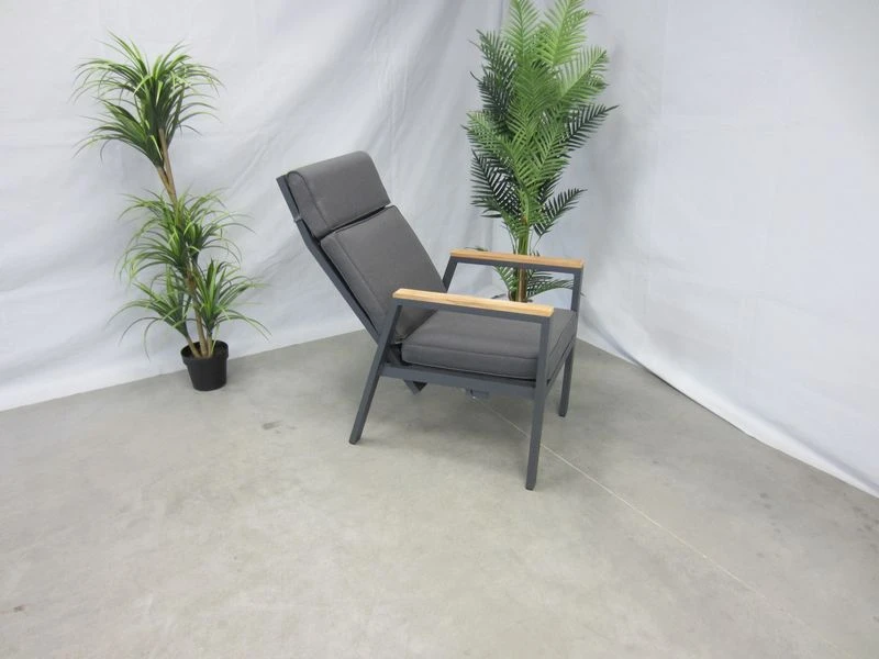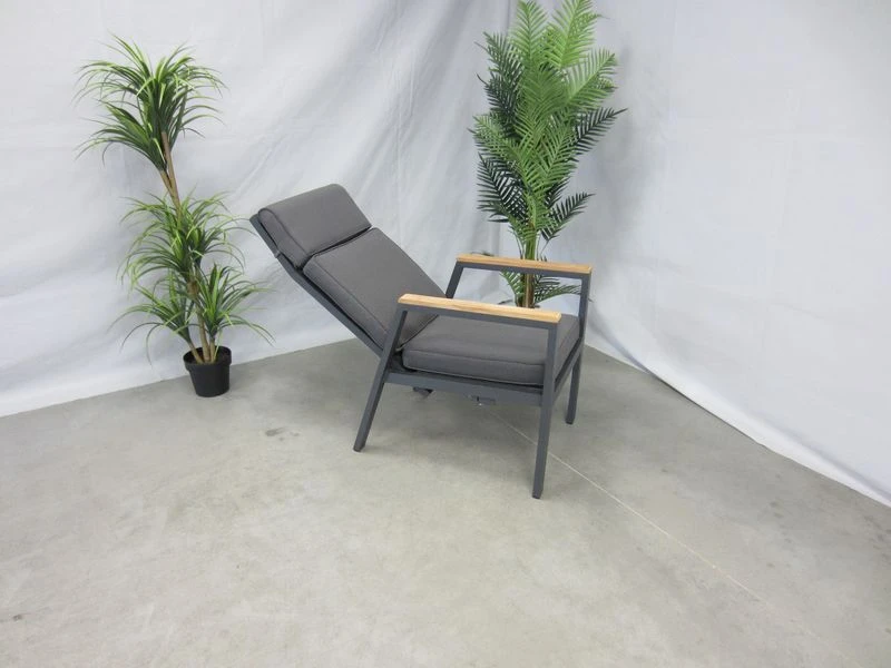 Het frame is van antraciet aluminum, met daartussen het kunstsof textilene materiaal. De armleuningen zijn afgewerkt met teak.